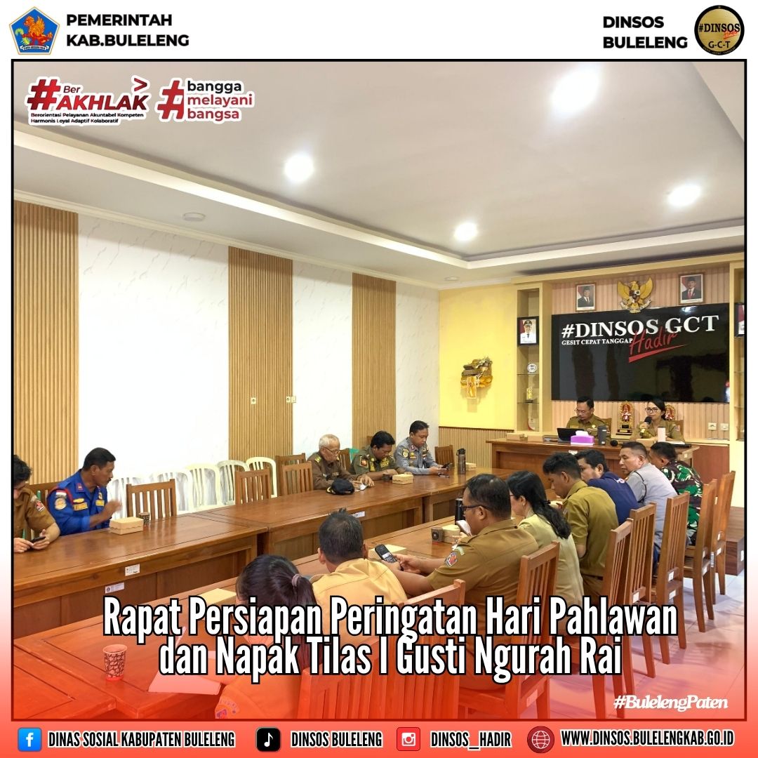 Dalam rangka memperingati Hari Pahlawan ke-80 Tahun 2025 serta mempersiapkan pelaksanaan kegiatan Napak Tilas Perjuangan Nasional I Gusti Ngurah Rai, Dinas Sosial Kabupaten Buleleng menggelar rapat koordinasi di Ruang Rapat Dinas Sosial Kabupaten Buleleng, Senin (20/10).