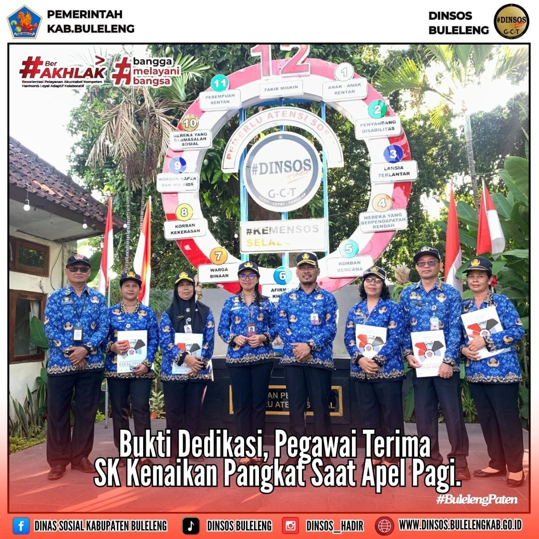 Suasana apel pagi hari ini berlangsung lebih istimewa dari biasanya. Seusai apel dilakukan penyerahan surat keputusan (sk) kenaikan pangkat fungsional kepada dra.yanti rohayati,3 sdm pegawai kenaikan pangkat regular kepada ni nyoman puspa adnyani,sh, kadek yartono,st dan ketut sukemini, serta penyerahan sk plt.kepala bidang pelayanan rehabilitasi sosial kepada ni luh riawati,s.sos.