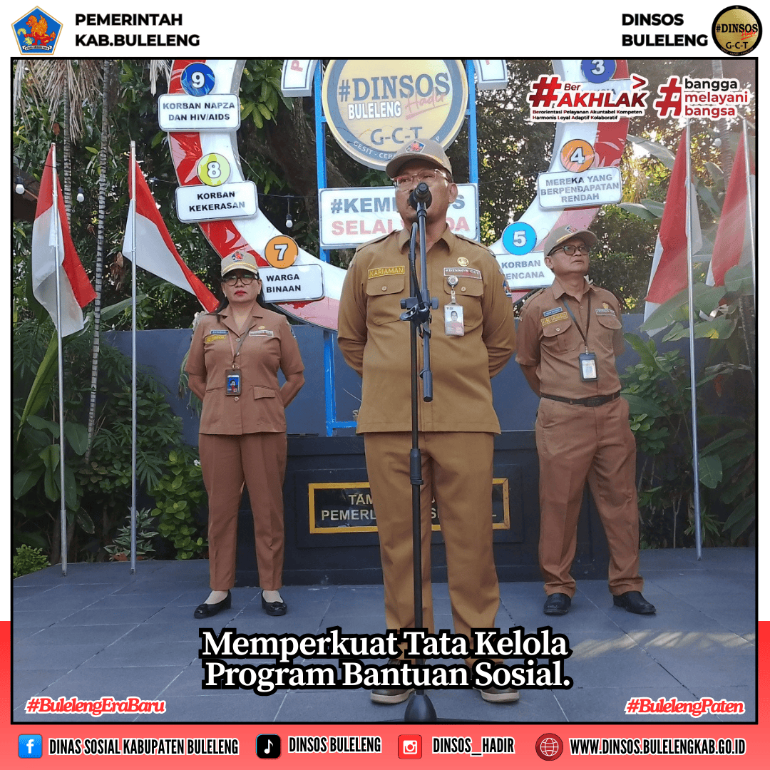 Kepala Dinas Sosial Kabupaten Buleleng I Putu Kariaman Putra,S.Sos,MM memimpin apel pagi yang diikuti oleh seluruh jajaran pegawai di lingkungan Dinas Sosial, bertempat di halaman kantor Dinas Sosial. Apel pagi tersebut dimanfaatkan sebagai momentum untuk menegaskan komitmen bersama dalam memperkuat tata kelola program bantuan sosial agar lebih tepat sasaran, transparan, dan akuntabel.